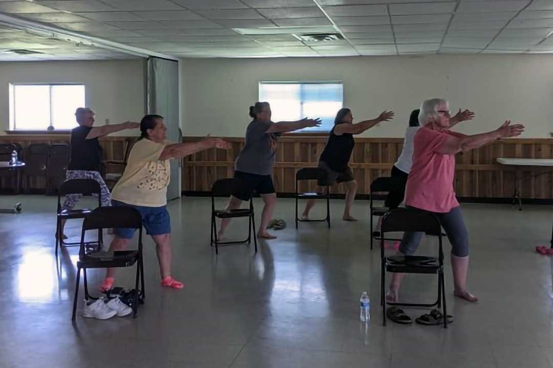 Additional activities listed on the flyer below include Chair Hatha Yoga, Day Trips, low-impact workouts, and special events.